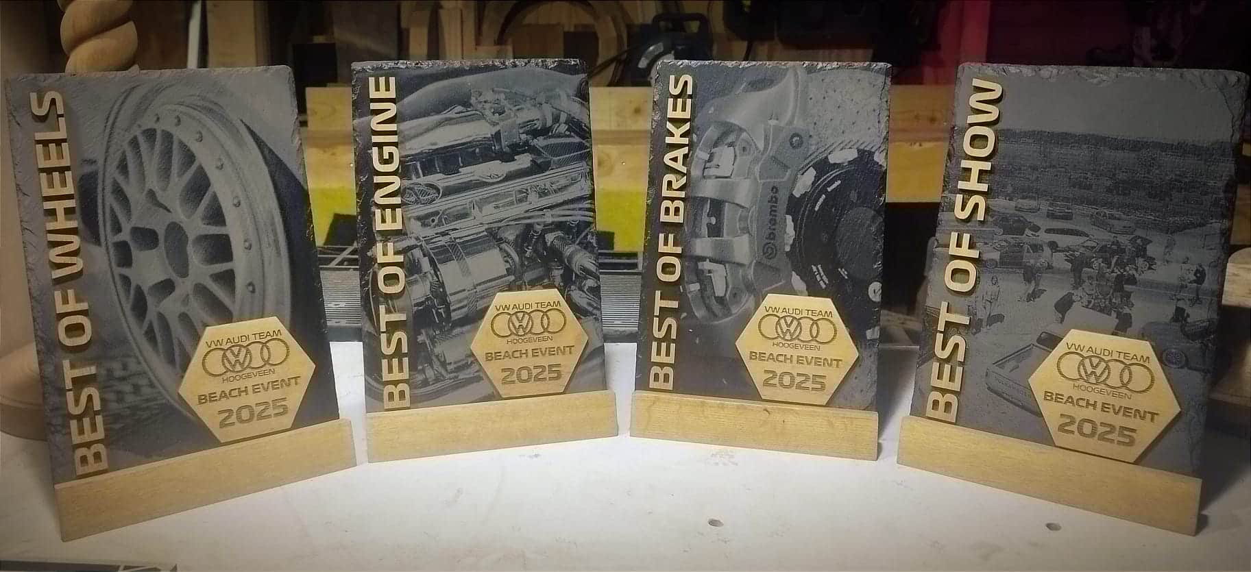 De mogelijkheden zijn eindeloos. We werken met natuurlijke materialen zoals eikenhout, olijfhout en leisteen die dankzij lasergravering een warme en luxe uitstraling krijgen. Perfect voor persoonlijke geschenken, zakelijke relatiegeschenken of speciale gelegenheden zoals bruiloften en jubilea.